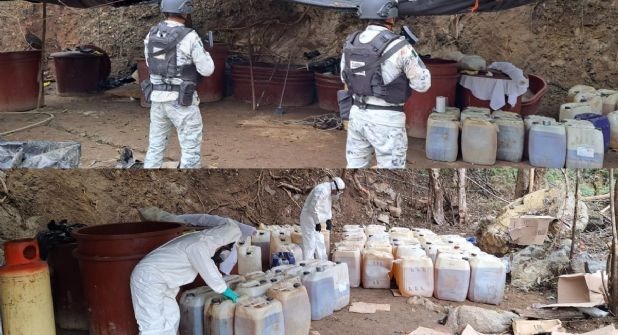 La GN dijo que sus elementos se encontraban realizando patrullajes en el municipio de Acatitán, cuando al circular por un camino de terracería los efectivos se dieron cuenta de un fuerte olor a sustancias químicas.