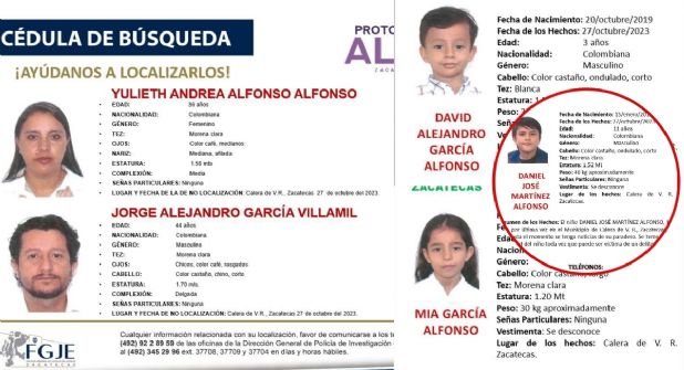 La tarde de ayer la Fiscalía del estado dio a conocer en sus redes sociales la ficha de búsqueda de las 5 personas, dentro de ellos destacan 3 menores de edad, para quienes fue activada la Alerta Amber; las personas fueron secuestradas el pasado 27 de octubre en el municipio de Calera.