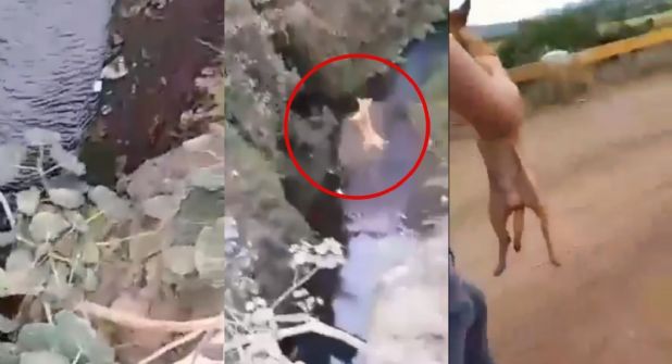 A los agresores se les escuchó gritar: “Se murió… No mames, a la verga, cayó vivo” mientras el menor se ríe y el joven vuelve a decir “dónde cayó”, “allá abajo” responde mientras señala con su dedo, de manera milagrosa el canino sale, visualmente ileso, pero el agresor toma su arma y le dispara, solo se escucha el chillido del perro.