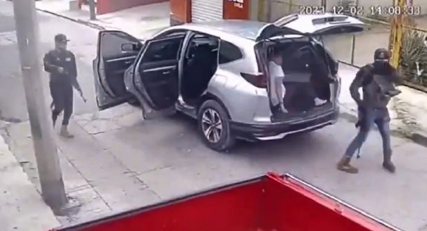 “Nacato” es encerrado en la cajuela de la camioneta, junto con la barra de acero con la que los hombres armados forzaron la puerta de la vivienda. Uno de los sujetos sale también de la casa cargando algo no identificado y se sube en los asientos traseros; otro saca de la vivienda un portafolio negro, mientras dos más disparan hacia un objetivo que no se ve en el video.