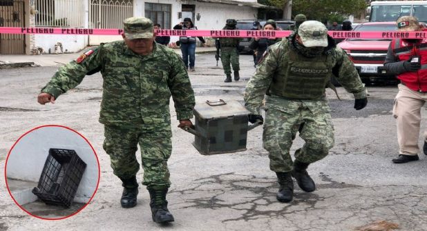 Ya cuando fue asegurado por la Sedena se puede ver a militares protegidos con equipo especializado que transportan una caja de metal muy robusta y pintada con el pixelaje característico del Ejército mexicano.