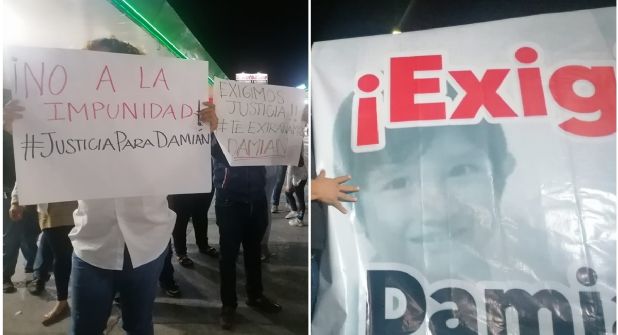 Previo a iniciar el recorrido tanto a pie como en auto, ellos colgaron una lona en el mencionado puente con la imagen de Damián Estrada Moreno y el mensaje: “Todo el peso de la ley para los responsables”.