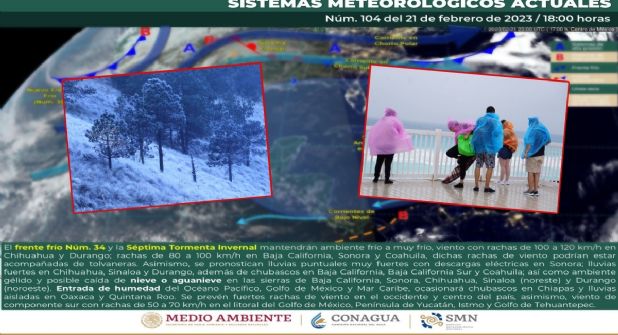 La Comisión Nacional del Agua (Conagua) ha pronosticado el clima para las próximas horas y ha dicho que el frente frío Núm. 34 y la Séptima Tormenta Invernal se desplazarán gradualmente sobre el noroeste y norte del territorio nacional, manteniendo ambiente frío a muy frío, viento con rachas de 100 a 120 kilómetros por hora en Chihuahua y Durango; rachas de 80 a 100 kilómetros por hora en Baja California, Sonora y Coahuila, dichas rachas de viento podrían estar acompañadas de tolvaneras.