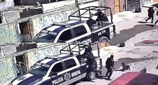 En el visual se puede ver que hay una unidad de la policía municipal, tipo panel, detenida afuera de una vivienda, cuando de pronto se ve que salen corriendo al menos seis policías, luego se ve a un perro que va tras de ellos e intenta morderlos. Cuatro uniformados se suben rápido a la camioneta para ponerse a salvo, mientras otros dos corren más lejos.