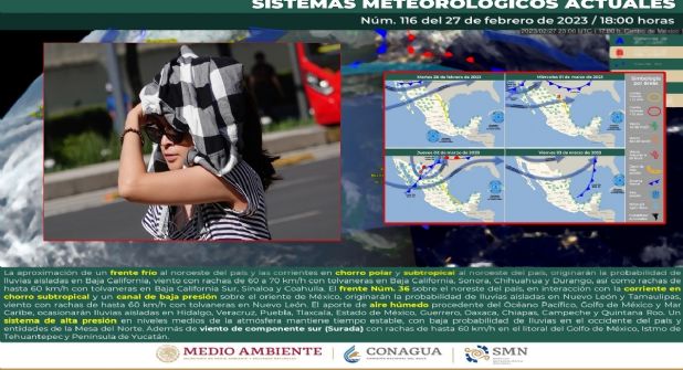 El frente Número 36 se encuentra en proceso de disipación sobre el noreste del país, está en interacción con la corriente en chorro subtropical y un canal de baja presión sobre el oriente de México, originarán la probabilidad de lluvias aisladas en Nuevo León y Tamaulipas, viento con rachas de hasta 60 kilómetros por hora con tolvaneras en Nuevo León.