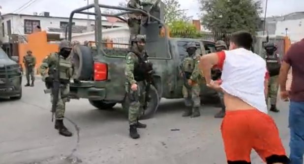 Ramos explicó que cuando llegaron a la avenida Huasteca, había todavía 12 unidades del Ejército alrededor de la camioneta baleada que era llevada por una grúa a las instalaciones de la Fiscalía y ante los reclamos de familiares un militar accionó su arma contra el suelo para dispersas a lo pobladores que agredieron con piedras y palos los vehículos de la Sedena.