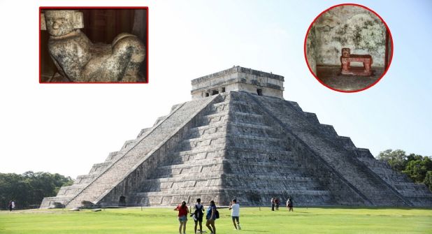 Debajo de la pirámide se encuentra un cenote y dentro de ella se encuentra una figura de Chac Mool y unos metros más adelante se encuentra la cámara de sacrificio, donde esta una escultura de un jaguar.