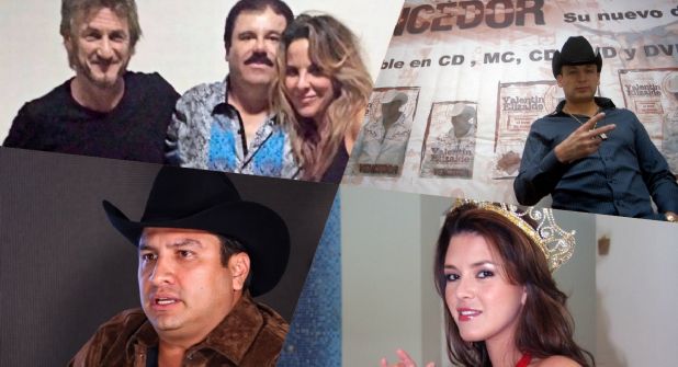 Valentín Elizalde: El famoso “Gallo de Oro” también se le ha vinculado por un corrido que cantó dos veces, al inicio y fin, en su última presentación en Reynosa en el año 2006, ya que saliendo de allí fue acribillado. En este lugar fueron hallados más de 70 casquillos de bala. Las versiones que han salido a la luz es que el corrido que canto, de nombre “A mis enemigos”, hablaba del Chapo, y esta misma se la dedicaría a sus rivales en el mundo del narco.