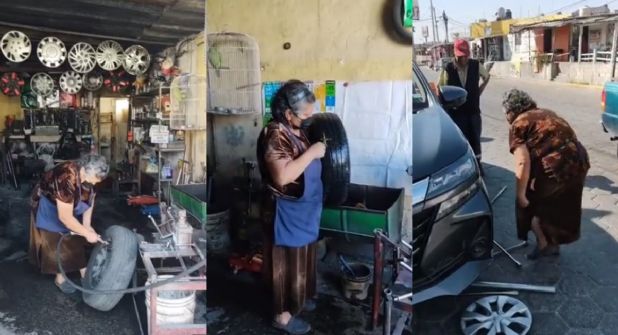 PUEBLA.- Doña Laura Cortés de 56 años de edad, trabaja desde hace más de 30 años en su vulcanizadora colocada en Tlaxcalcingo, Puebla; así ha podido salir adelante, pues se ha dedicado a la reparación de neumáticos y al oficio de la “talacha”. Su historia fue compartida a través de una creadora de contenido en TikTok llamada @granangularagencia.