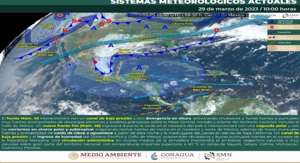 Este frente provocará fuertes lluvias, las cuales pueden estar acompañadas de granizo. El Servicio Meteorológico Nacional (SMN) ha publicado un mapa, en el cual se indica que entre el 29 y 31 de marzo, el Frente Frío 45 se extenderá en el noreste del país, interaccionará con otros fenómenos meteorológicos y provocará lluvias en diversos estados, en algunos serán tan fuertes que habrá granizo, así que tendrás que tener cuidado con deslaves, inundaciones y más.