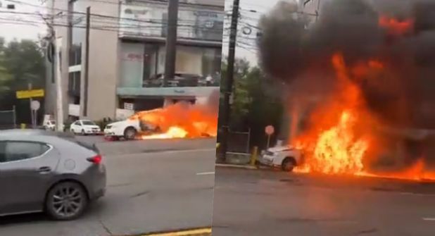 Elementos de Bomberos de Nuevo León y Rescate 911 de Protección Civil de San Pedro acudieron al auxilio donde no hubo personas lesionadas. En videos captados por transeúntes y automovilistas se observa cómo avanza en llamas el vehículo.