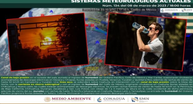 Se esperan suradas con rachas de hasta 70 kilómetros por hora y tolvaneras en Coahuila, Nuevo León y Tamaulipas. Por su parte, la entrada de humedad del Océano Pacífico, propiciará lluvias aisladas en Jalisco, Colima, Michoacán y Guerrero, con posibles descargas eléctricas.