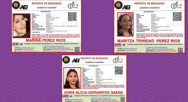 La Fiscalía General de Justicia del Estado fue la que informó esta decisión, el objetivo es encontrar a Marina Pérez Ríos, de 48 años; Maritza Trinidad Pérez Ríos, de 47, y Dora Alicia Cervantes Sáenz, de 53 años.