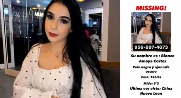 MONTERREY.- Familiares de Bionce Amaya Cortez, de 26 años de edad, de la Ciudad de Mission, Texas, reportaron su desaparición en el municipio de China, Nuevo León, unos 100 kilómetros al oriente de Monterrey. Bionce esapareció desde el pasado domingo, tras pasar la Semana Santa en Nuevo León, y quienes le acompañaron aquí la dejaron en la noche de ese día en una calle oscura a la entrada del municipio de China, desde donde tomaría un vehículo hacia Texas, donde reside.