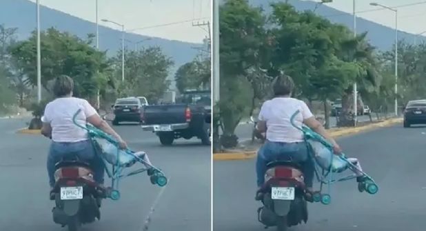 MORELIA.- Una pareja se viralizó el redes sociales luego de ser exhibida transportando una carriola en una motocicleta, en Sahuayo, Michoacán. En las imágenes se ve a un hombre conduciendo la motoneta mientras que en la parte trasera va una mujer sosteniendo la carriola (con un solo brazo) en la que se puede observar a una niña con sus pies colgando.