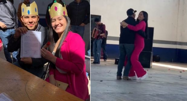 Como parte de la ceremonia les piden que se agarren las manos para dar paso a la gran pregunta sobre si se aceptan en matrimonio. Sin dudarlo, el joven dice “acepto”, pero la maestra muestra ciertas dudas sobre dar el sí, pero finalmente acepta. “Dijo que sí. A poco iba a negar este colágeno maestra”, escribió Jesús en el video.