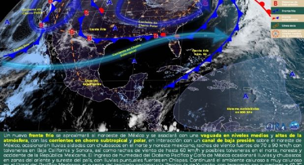 El Servicio Meteorológico Nacional (SMN) pronostica que el clima para este lunes 1 de mayo de 2023 en el país: prevé lluvias y calor. Un nuevo frente frío se aproxima al noroeste de México, se asociará con una vaguada en niveles medios y altos de la atmósfera, además de las corrientes en chorro subtropical y polar, y en interacción con un canal de baja presión sobre el noreste, lo que provocará lluvias y rachas de viento de 70 a 90 km/h con tolvaneras.