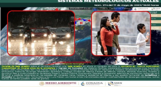 Las condiciones meteorológicas serán originadas por una baja presión en altura sobre el noroeste del país, la corriente en chorro subtropical, inestabilidad en niveles altos de la atmósfera y por el ingreso de humedad del Océano Pacífico, así como por dos canales de baja presión, el primero extendido desde el norte hasta el centro del territorio nacional, y el segundo extendido desde el noreste hasta el oriente del país, en interacción con la entrada de humedad del Golfo de México.