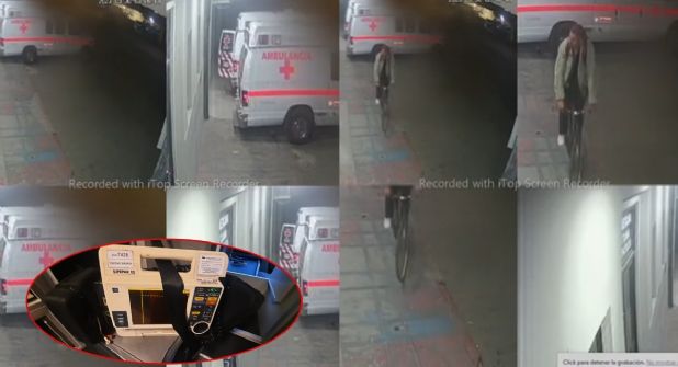 En el vídeo se puede ver cuando un sujeto a bordo de una bicicleta arriba a altas horas de la noche a la estación de la ambulancia, esta unidad se encuentra sin seguro en la puerta, por lo que el hombre ingresa, tarda varios minutos y sale con el botín.