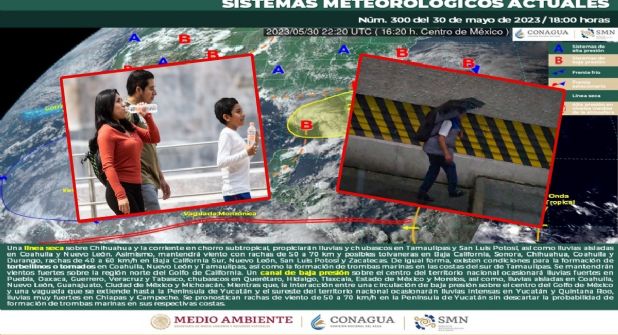 - Viento con rachas de 60 a 70 km/h y tolvaneras: Baja California y Sonora, y con posible formación de torbellinos: Chihuahua y Coahuila.