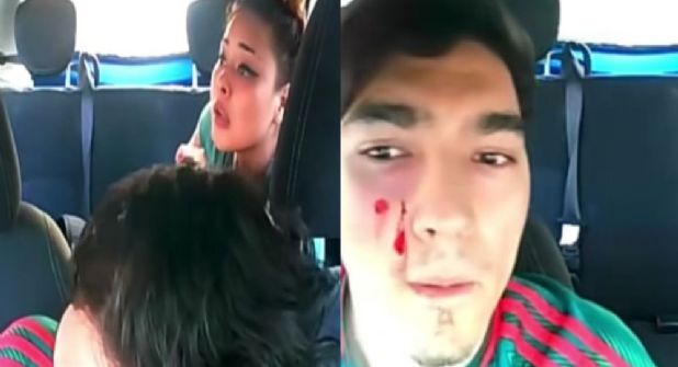 El video fue grabado por la cámara de seguridad del taxi de aplicación y se aprecia cómo el joven conductor es golpeado en la cara pensando que era el amante de la chica.