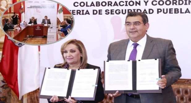 TLAXCALA.- Para contribuir a tener un México en paz y tranquilidad y como muestra de la voluntad política de ambos estados, para trabajar en favor de la sociedad, el gobernador Sergio Salomón Céspedes Peregrina y su homóloga de Tlaxcala, Lorena Cuéllar Cisneros, firmaron el Convenio de Colaboración y Coordinación Interinstitucional en materia de seguridad, que permitirá reforzar la coordinación y el intercambio de información para la prevención y el combate de la delincuencia.