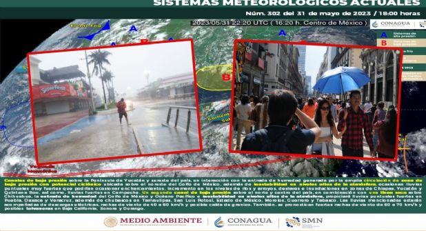 Otro canal de baja presión sobre la Península de Yucatán y sureste del país, aunado al ingreso de humedad del Mar Caribe, propiciarán lluvias y chubascos en ambas regiones. Las lluvias descritas se acompañarán de descargas eléctricas, rachas de viento y posible caída de granizo.