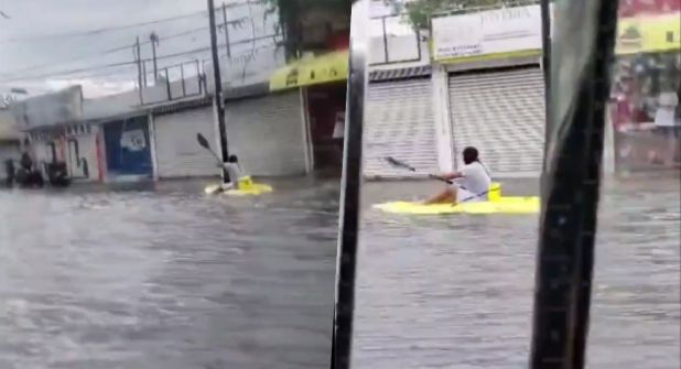 CHETUMAL. – A través de redes sociales se ha hecho viral un video de un hombre que fue captado usando un kayak para trasladarse por las calles de Cancún, Quintana Roo, después de que este sábado 10 de junio cayera una tormenta e inundará las calles de la zona.