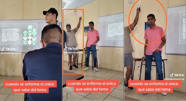 El video fue dado a conocer en la cuenta de TikTok (@amadeusIyescas), quien decidió grabar el momento justo en el que un joven se encuentra parado frente a su clase exponiendo mientras está conectado a un suero.