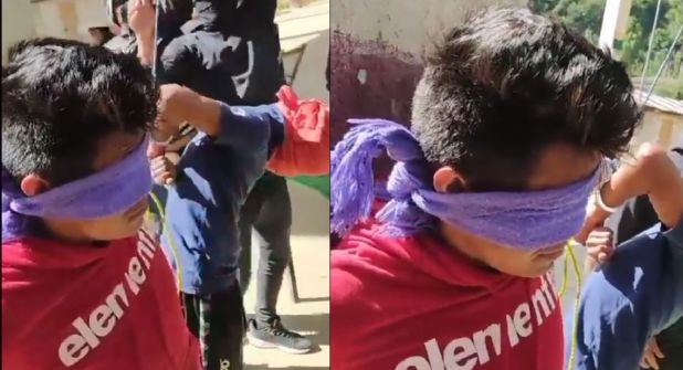 A través de un video registrado por los manifestantes, se captura el instante en el cual uno de los menores, con su rostro oculto y sus manos atadas, es suspendido en la plaza municipal.
