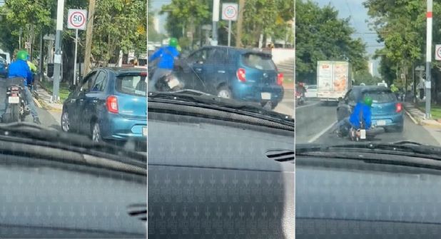 Por medio de redes sociales se difundió el video del momento en que el conducto del auto compacto atropella al motociclista. Sin embargo, en el video se observa que el motociclista obstruye el paso del segundo para no dejarlo avanzar.