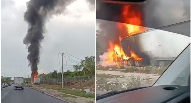 La mañana de este martes 22 de agosto se registró el incendio de un tráiler cerca del Aeropuerto Internacional de Cancún, Quintana Roo, luego de un accidente de tránsito, hecho por el cual no se reportan víctimas, de acuerdo con información de medios locales. En videos compartidos en redes sociales se observa a la unidad con la cabina en llamas a un costado de la vialidad.