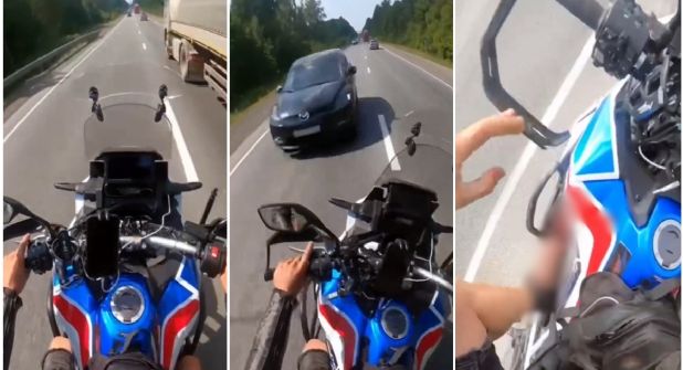 En las imágenes se observa el momento en que el motociclista vira hacia la izquierda para cambiar de carril y rebasar la unidad delante de él, sin embargo de frente se aproxima un vehículo marca Mazda color oscuro, el cual alcanza a impactar el costado de la motocicleta y se observa cómo sale disparada la bota del motociclista.