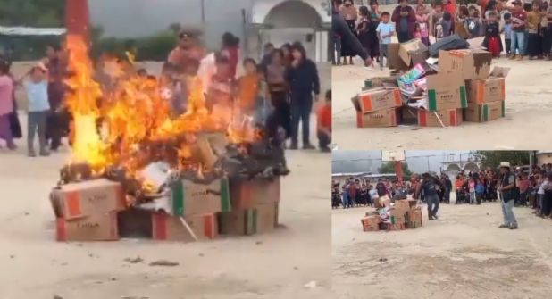En un video que se ha hecho viral en redes sociales se logra que habitantes pusieron las cajas y todos los libros que han sido llevados en la comunidad en medio de una cancha, de momento, un hombre rocía lo que parece ser gasolina y un segundo sujeto le arroja un cerrillo, en el momento en que comienza a prender los textos la gente grita y rechifla en forma de celebración. En el lugar se pueden ver niños, jóvenes y mujeres que miran las llamas consumir los libros