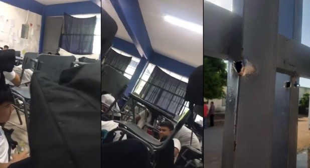 Las imágenes que circularon en redes sociales muestran cómo los estudiantes se ocultan debajo de los mesabancos, mientras se escuchan las detonaciones de arma de fuego, presumiblemente de grueso calibre, por el estruendo.