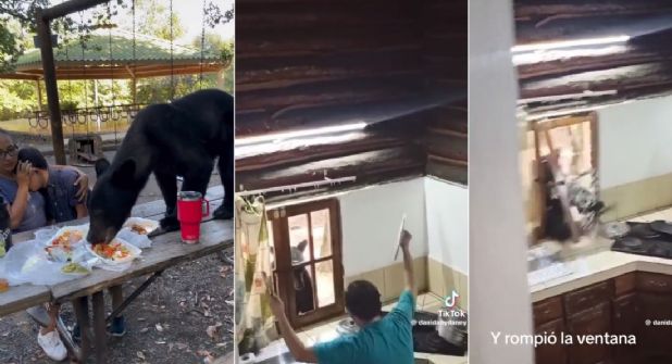 MONTERREY.- Este lunes se viralizaron en redes sociales dos videos en los que se aprecia a osos con hambre, que se acercan a familias con la intención de llevarse su comida. Uno en un parque y el otro se quiere meter a una cabaña, para lo cual rompe una ventana.