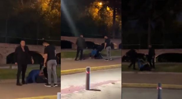 En un video que circuló el jueves en redes sociales se ve cómo dos sujetos vestidos totalmente de negro golpean a un joven tirado en el piso hasta que un tercer individuo que viste playera negra y pantalón de color claro se acerca y les indica que paren la agresión.