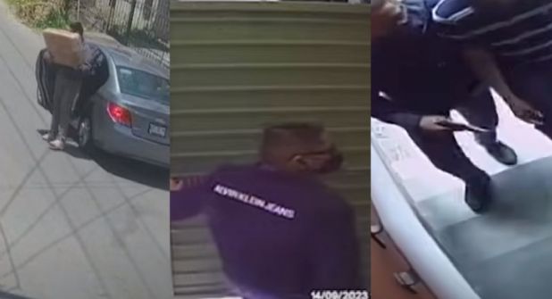 En el video se puede observar cómo un individuo desciende del asiento trasero de un automóvil gris y finge ser un repartidor con una caja de cartón que contiene los nombres de al menos un habitante del domicilio. Este sujeto toca el timbre y, una vez que le permiten ingresar por el interfono, hace una llamada telefónica con su teléfono celular.