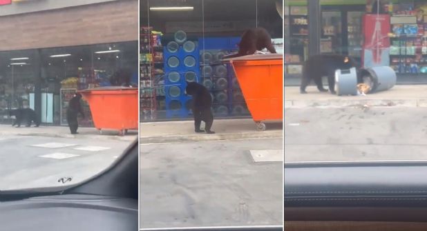 De acuerdo con el video captado por un conductor desde su vehículo, 2 de los oseznos buscan comida en un contenedor de basura de la tienda, mientras que un tercero tumbó un bote más pequeño ubicado en el acceso de la tienda de conveniencia.