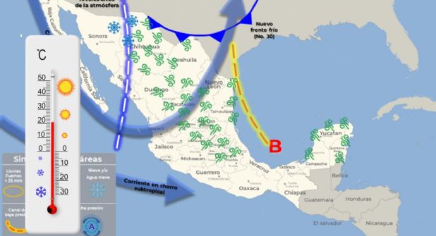 Asimismo, el ingreso de humedad derivado el este nuevo frente frío ocasionará lluvias aisladas en el sureste de la República Mexicana, principalmente en la Península de Yucatán; cabe resaltar que dicho frente frío se extenderá principalmente sobre el noroeste del Golfo de México y el oriente del territorio nacional.