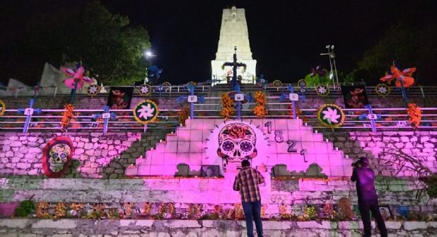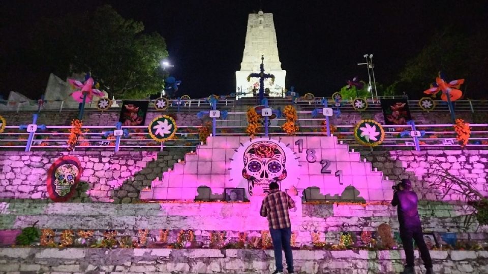 Durante 20 horas sin descanso, pues empezaron desde este miércoles por la noche, los participantes colocaron en las gradas del monumento del Parque Bicentenario de esta capital diferentes elementos como frutas y verduras (caña de azúcar, mandarinas, tejocotes, guineos, calabazas, entre otros), más de mil veladoras, cerca de una tonelada de flores, principalmente la típica de cempasúchitl.