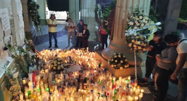 El ayuntamiento de la capital de Guerrero, estuvo la noche de este martes iluminado con velas, coronas con flores blancas colocadas en la entrada principal y a su alrededor decenas de ciudadanos que siguen consternados por tan semejante acto de barbarie.