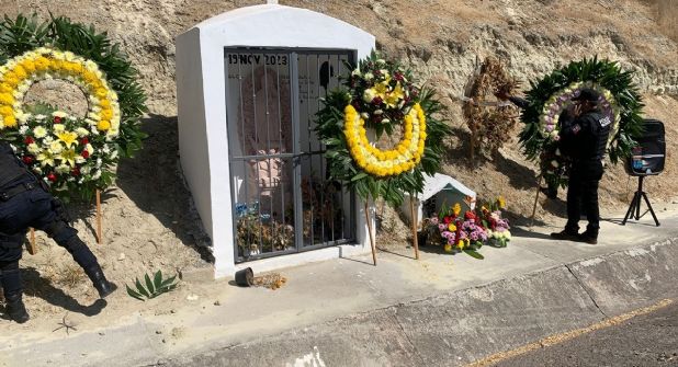 Los pobladores colocaron flores y veladoras, en la capilla que construyeron en memoria de los tres oficiales de la Secretaría de la Defensa Nacional, muertos a tiros, sobre el libramiento de Teocaltiche.