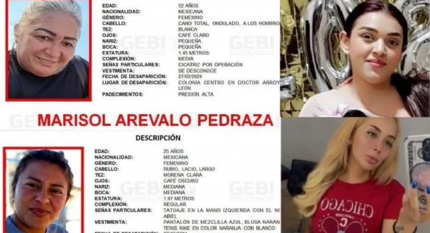 La Fiscalía General de Justicia de Nuevo León recibió el reporte de la desaparición de Karla Azucena Moreno Barrios, de 25 años de edad, y Marisol Arévalo Pedraza, de 52, nuera y suegra, respectivamente. Otilia Barrios, tía de Karla, informó que las mujeres salieron del Ejido Jesús María Berrones con rumbo al centro de la cabecera municipal de Doctor Arroyo, para comprar pañales en una farmacia.