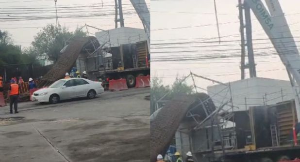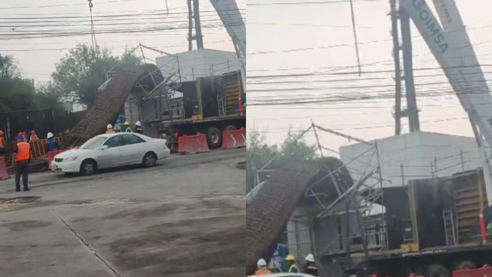 Monterrey. - Una columna de varillas de la construcción de la Línea 6 del Metro se venció y cayó sobre la avenida Prolongación Madero.