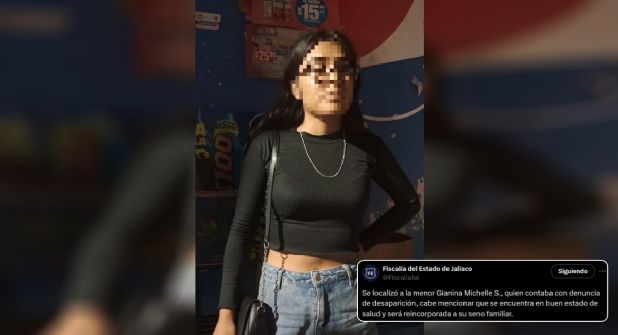 GUADALAJARA. - La Fiscalía del Estado de Jalisco informó a través de redes sociales que la estudiante de preparatoria de la Universidad de Guadalajara (UdeG), Gianina Michelle S., quien contaba con una denuncia de desaparición fue localizada en buen estado de salud, tras haberse asentado por voluntad propia. Luego de los operativos correspondientes de búsqueda y localización fue reincorporada a sus familiares.