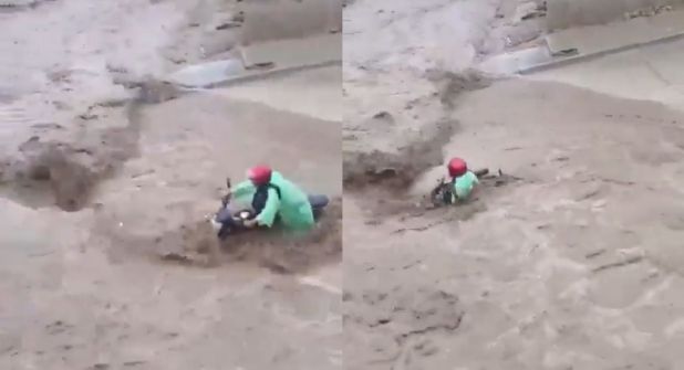 Oaxaca, Oaxaca.- Un motociclista se volvió viral en redes sociales tras ser arrastrado por un caudal de agua en la avenida Monte Alban, de la colonia San Martín Mexicapam, en Oaxaca, a consecuencia de las fuertes lluvias que dejó el paso de "Alberto" como depreciación tropical en la zona.