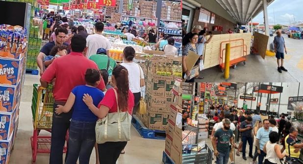 A través de videos y fotos compartidas en redes sociales se puede ver que los yucatecos salieron a las tiendas de autoservicio y dejaron vacíos anaqueles de comida enlatada y otros artículos como arroz, frijoles y agua.