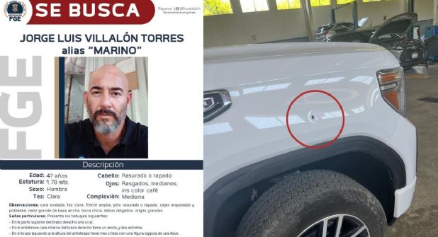 Los datos de identificación de Jorge Luis Villalón Torres, el Marino, son: hombre de 47 años, complexión mediana, estatura 1.78 metros aproximadamente; tez clara, frente amplia; pelo rasurado o rapado, cejas arqueadas y pobladas, ojos rasgados y medianos de iris café; nariz grande de base ancha; boca chica de labios delgados y orejas grandes.