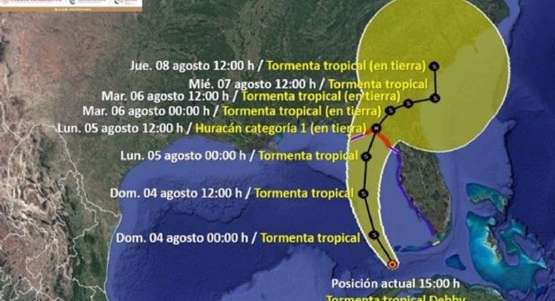 El organismo prevé que Debby avanzará por el golfo de México hasta alcanzar la costa de Florida el domingo por la noche o el lunes con fuerza de huracán.
